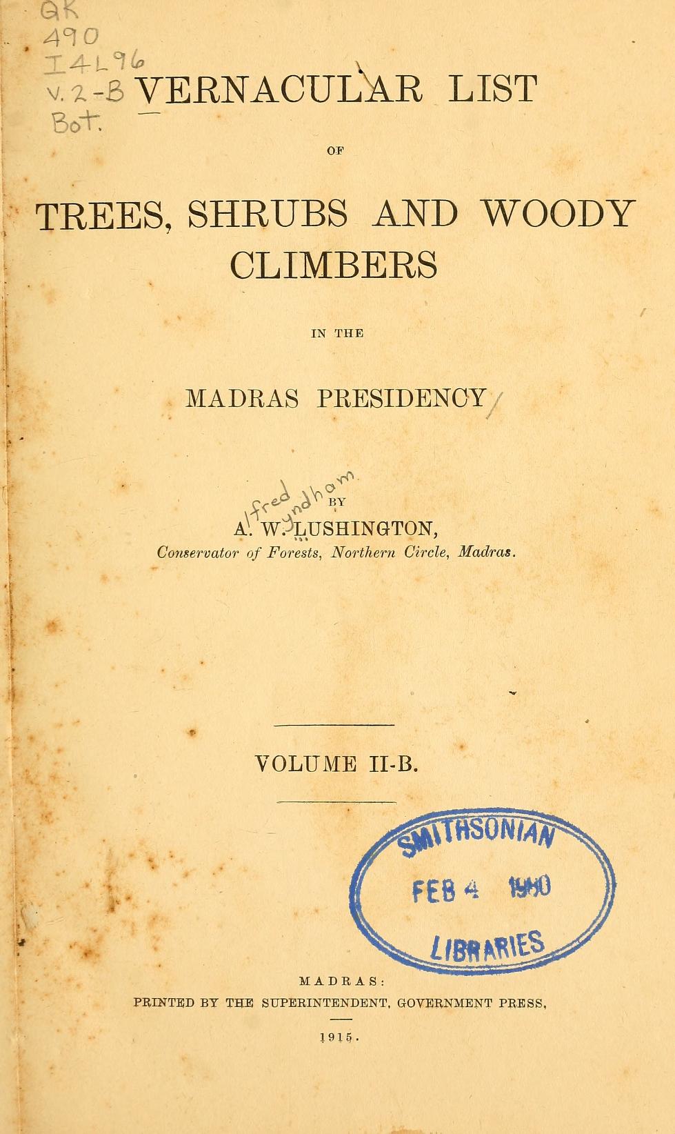 Vernacular list of trees, shrubs, and woody climbers in the Madras Presidency. v. 2-B