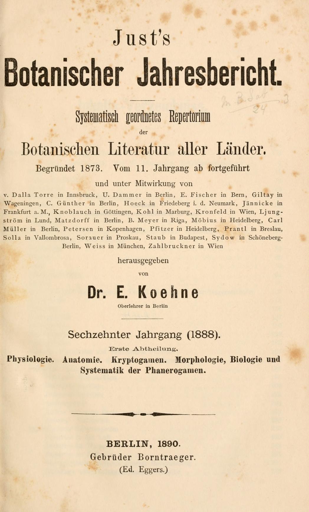 Just's botanischer jahresbericht. Systematisch geordnetes repertorium der botanischen literatur aller länder.Jahrg. 16, Abt. 1 (1888)