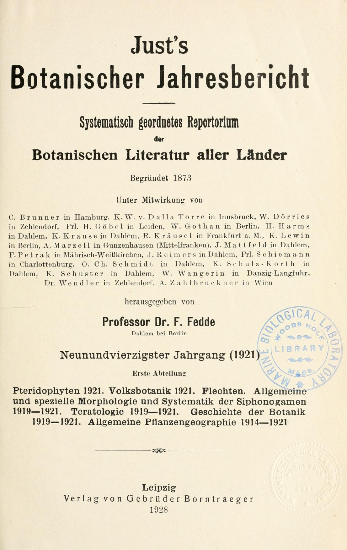 Just's botanischer jahresbericht. Systematisch geordnetes repertorium der botanischen literatur aller länder.Jahrg. 49, Abt. 1 (1921)