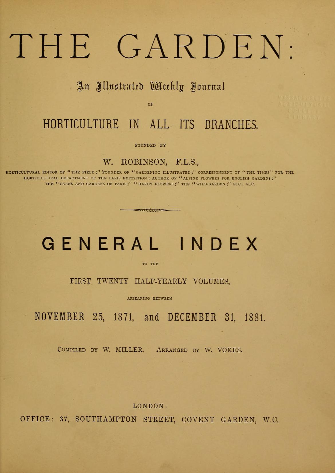 The Garden: an illustrated weekly journal of gardening in all its branches.v.1-20 1871-81 Index