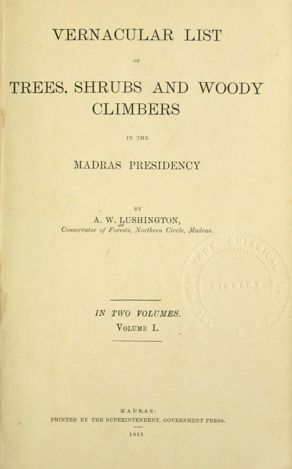 Vernacular list of trees, shrubs, and woody climbers in the Madras Presidency. and woody climbers in the Madras Presidency.